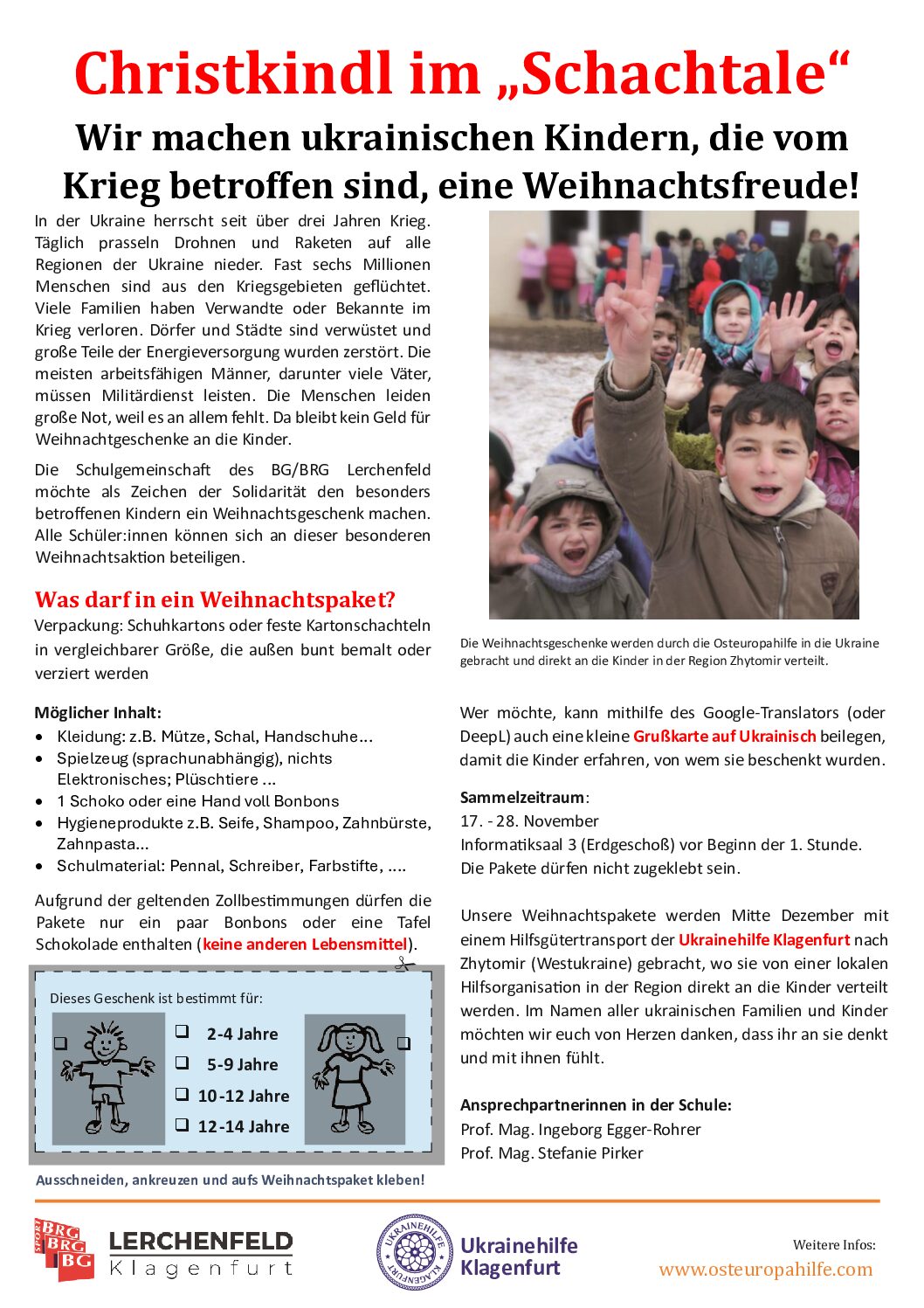 Die Schulgemeinschaft des BG/BRG Lerchenfeld möchte als Zeichen der Solidarität den besonders betroffenen Kindern ein Weihnachtsgeschenk machen. Alle Schüler:innen können sich an dieser besonderen Weihnachtsaktion beteiligen.