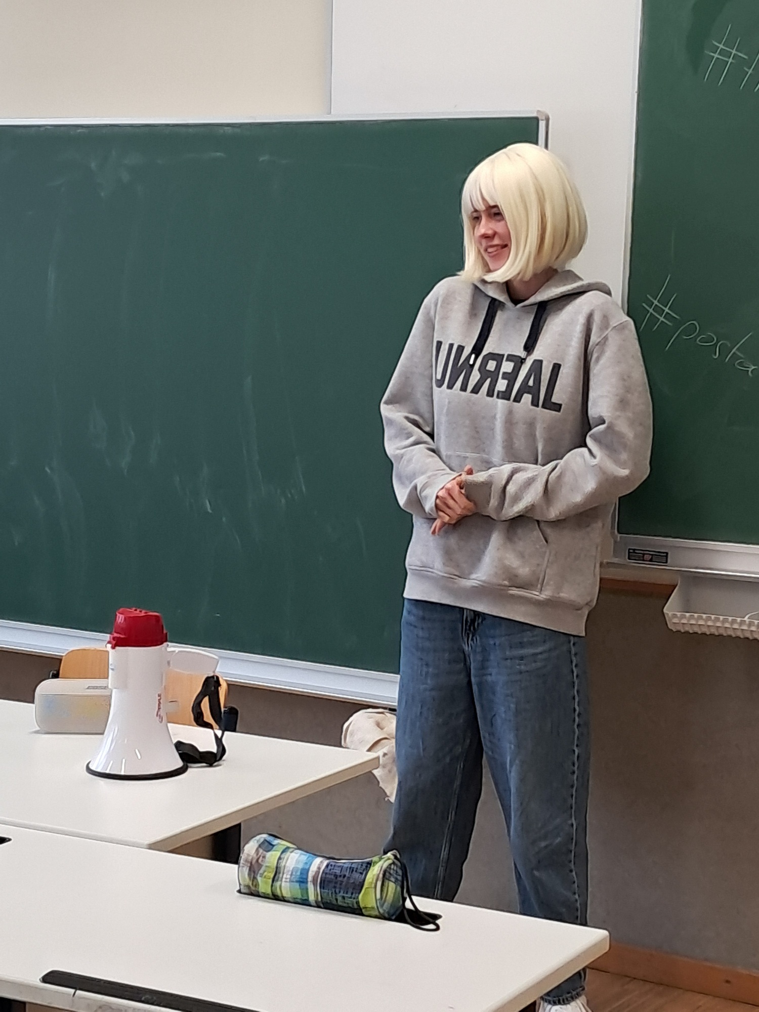 In der Theateraufführung ging es um Social Media und KI. Zwei Schauspieler kamen zu Beginn mit einer großen Kiste in die Klasse. Als Erstes spielten sie eine lustig dargestellte, aber trotzdem ernste Geschichte von einem jungen Mädchen, das gerne Fotos online postet und es wurde erklärt, warum das Posten von Fotos schlimme Folgen haben kann. Doch in der Mitte der Geschichte begannen die Schauspieler zu streiten und es sah sehr real aus. Danach wurde es sehr emotional. Die Frau spielte uns vor, dass sie magersüchtig war und wie schlimm das war. Danach erzählte der Mann uns, dass er von seinem Vater nie richtig respektiert wurde und welche Folgen das auf sein jetziges Leben hat.