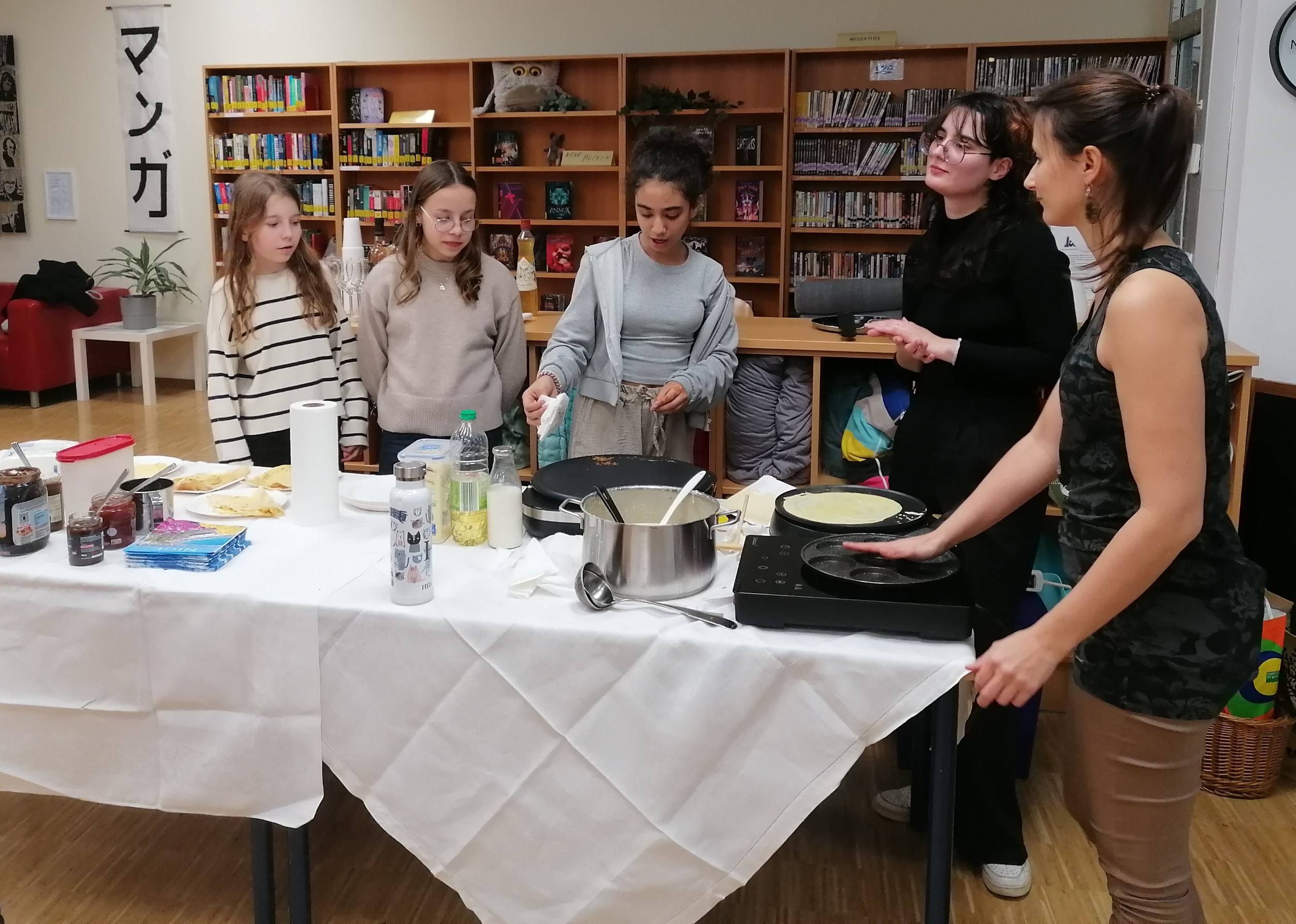 Am 2. Februar lud die Fachgruppe Französisch zur Soirée Cinéma. Traditionellerweise trafen sich Schüler:innen, Lehrer:innen, Eltern und Freund:innen des französischen Films in unserer gemütlichen Schulbibliothek. Bevor der Film « Les Choristes » von Christophe Barratier präsentiert wurde, feierten alle mit Crêpes « La Chandeleur ». Die Schüler:innen der dritten Klassen unterstützten tatkräftig beim Crêpesbacken.